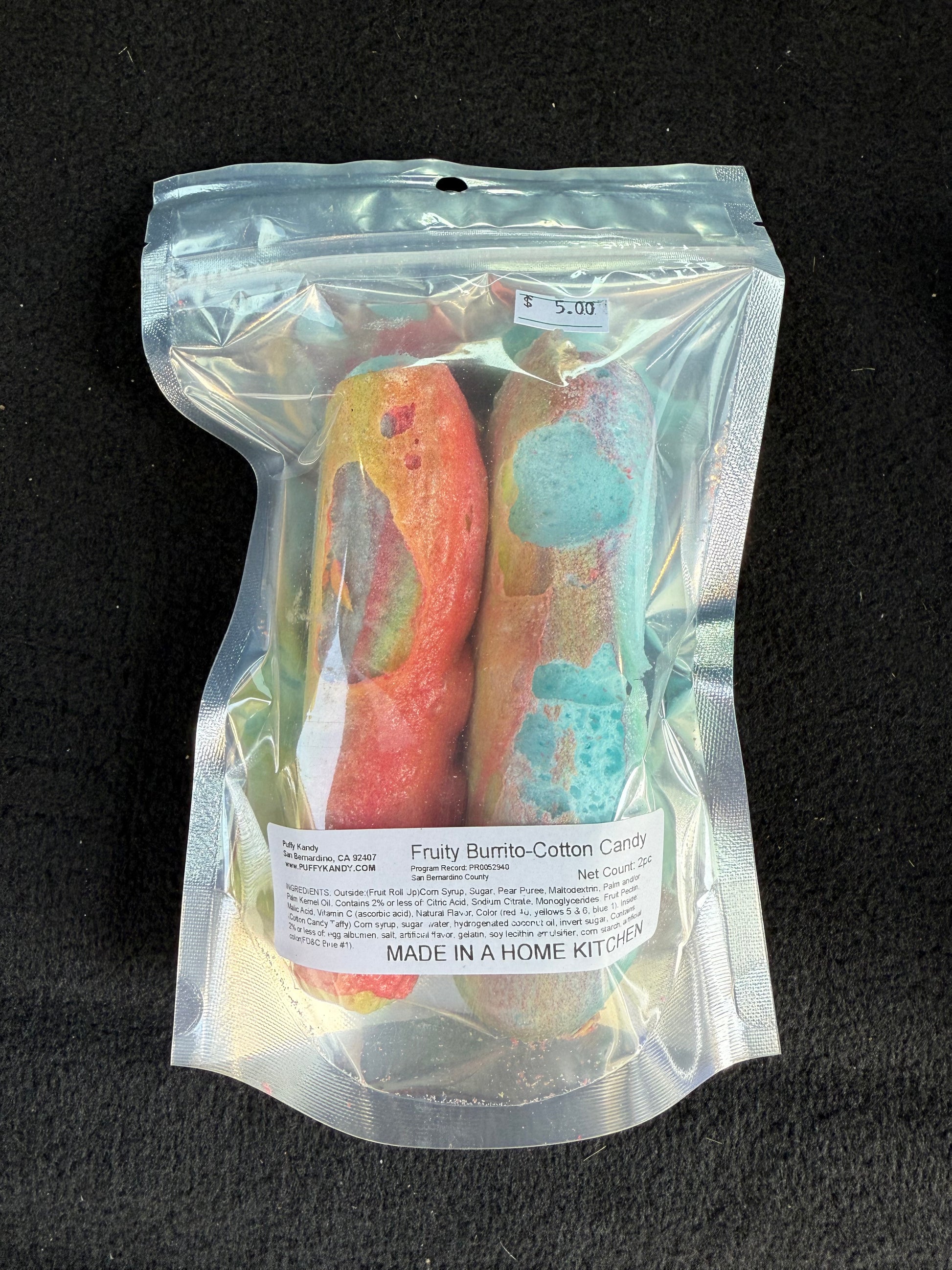 These are my own creation! Inside is salt water taffy and the outside is fruit roll-up. We offer these in 3 inside taffy flavors. These burritos are huge! They come 2 per bag. Pick your inside taffy flavor.
